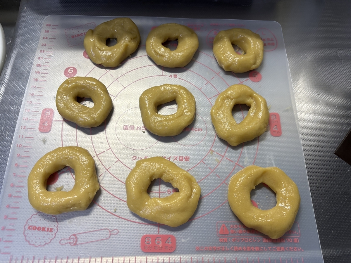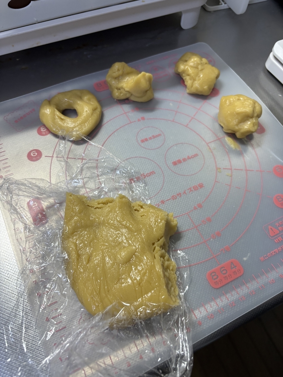 材料を混ぜた時点では生地がベタベタしてうまくまとまりませんでしたが、レシピ通り冷蔵庫で休ませることで、成形しやすくなりました!
